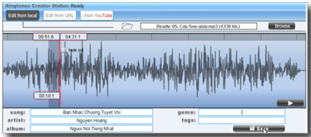 Một khi đã được MadRingtones tải lên thành công, bạn tiến hành xác định thời gian bắt đầu và kết thúc nhạc chuông muốn tạo ra. Nếu thích bạn điền đầy đủ thông tin như: Song (tên bài hát), artist (tên nhạc sĩ), album (tên album), genre (thể loại) và tags. Sau đó nhấn Save để lưu lại khoảnh khắc hay nhất của bài hát mà bạn đã chọn. Bây giờ thì bạn hãy chờ MadRingtones xử lý xong sẽ có 4 định dạng chuyên dành cho các thiết bị di động như: MP3, AMR, OGG và M4R. Bạn chỉ xem thiết bị di động hỗ trợ định dạng nào và nhấn vào nó và tải về.