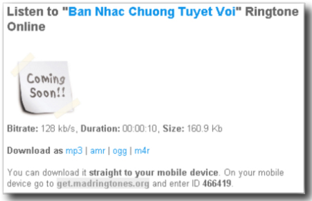 Ngoài ra, MadRingtones còn cho phép bạn tìm kiếm những bản nhạc chuông có sẵn được các thành viên nhiệt tình chia sẻ tại đây. Hiện tại, MadRingtones chỉ cung cấp trên 319.964 bản nhạc chuông và 9.268 các bài hát do nhạc sĩ sáng tác. Hơn nữa, bạn cũng được nghe trên top 50 những bản nhạc chuông mới nhất, tha hồ chia sẻ cho bạn bè, người thân thông qua web hoặc blog cá nhân. Và thêm một điểm thú vị nữa cho dù bạn không phải đăng ký trở thành thành viên mà vẫn được tải về và sử dụng.
